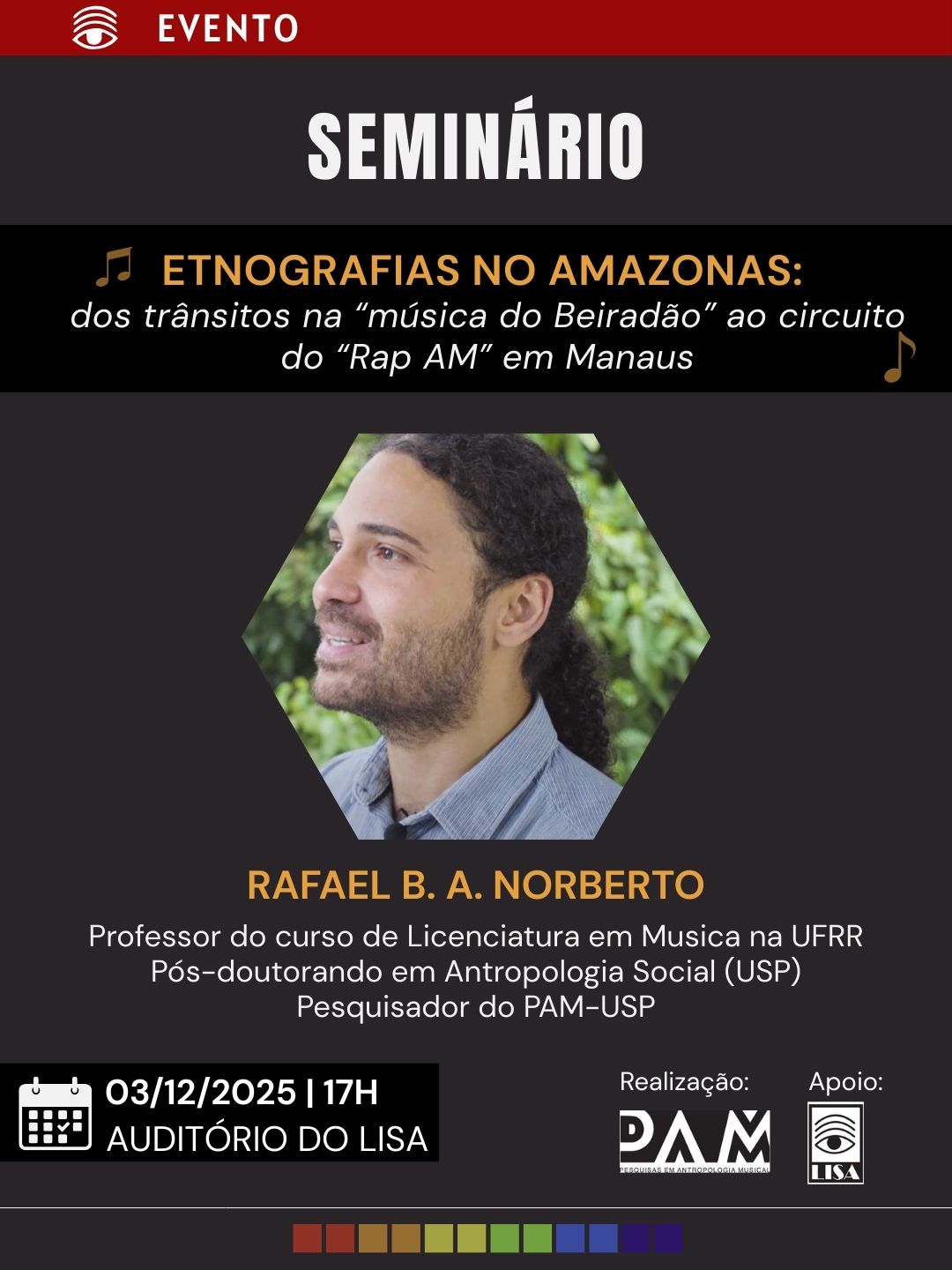 On December 3, 2025, at 5 PM, the Laboratory of Image and Sound in Anthropology at the University of São Paulo (LISA-USP) will host the seminar “Ethnographies in the Amazon: from the transits in the ‘Beiradão music’ to the ‘Rap AM’ circuit in Manaus,” which will be presented by Rafael Branquinho Abdala Norberto, researcher of the “Research in Musical Anthropology” group (PAM-USP) and postdoctoral fellow in the Department of Anthropology at the Faculty of Philosophy, Letters and Human Sciences of USP (DA-FFLCH-USP). The event is open to the public.